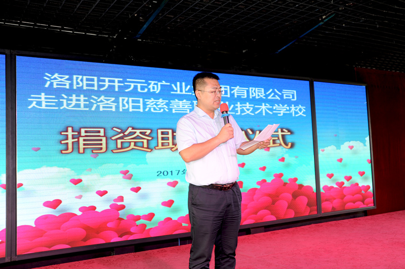 2017年9月21日上午,受許明月董事長委托,洛陽開元礦業(yè)集團(tuán)有限公司副總經(jīng)理?xiàng)畲荷?、總?jīng)理助理叢萬通、辦公室主任張愛利及集團(tuán)員工代表赴洛陽慈善職業(yè)技術(shù)學(xué)校進(jìn)行捐資助學(xué)活動(dòng),洛陽慈善總會(huì)副會(huì)長兼秘書長郝春苑、慈善學(xué)校全體師生及相關(guān)媒體記者等參與了本次活動(dòng)。