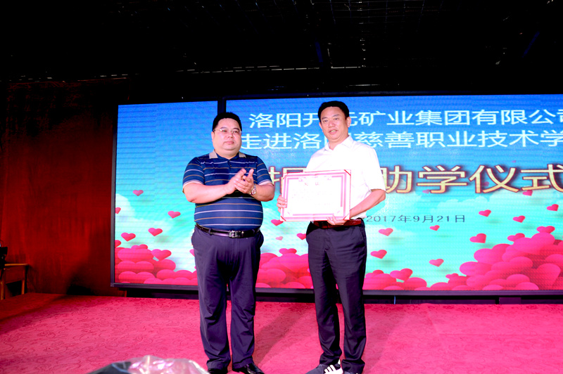 集團(tuán)副總經(jīng)理?xiàng)畲荷砺尻栭_元礦業(yè)集團(tuán)向洛陽慈善職業(yè)技術(shù)學(xué)校捐贈(zèng)新生校服西裝,洛陽慈善職業(yè)技術(shù)學(xué)校賈國彪校長為洛陽開元礦業(yè)集團(tuán)有限公司頒發(fā)榮譽(yù)證書,并向全校師生展示新校服。